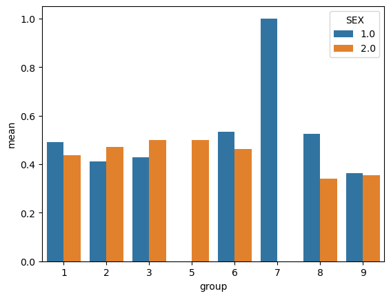 import seaborn as snsmeans = df.groupby(["group", "SEX"])["label"].mean().reset_index(name ="mean")sns.barplot(data = means, x ="group", y ="mean", hue ="SEX")