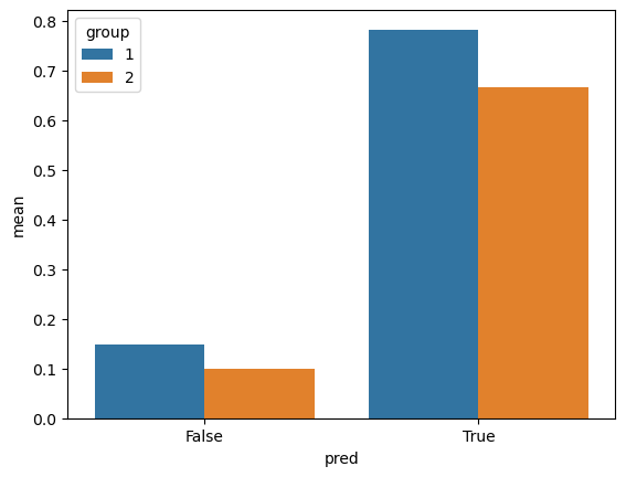 df_test["pred"] = y_preddf_test = df_test[white_ix|black_ix]means = df_test.groupby(["group", "pred"])["label"].mean().reset_index(name ="mean")p = sns.barplot(data = means, x ="pred", y ="mean", hue ="group")
