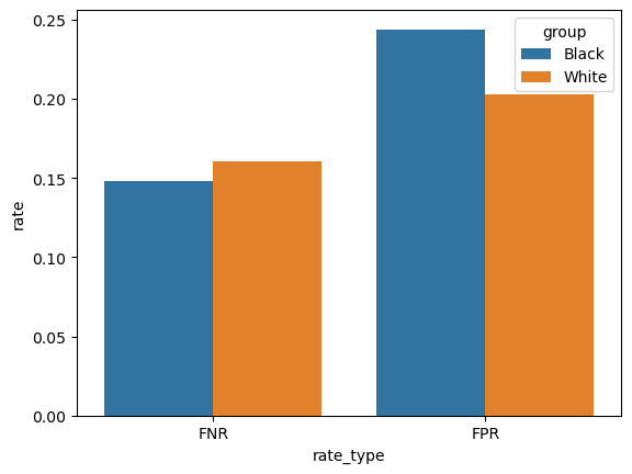 Next we’ll break down PPV, FPR and FNR by group. We see that false positive rates are higher than false negative rates across both groups, but the gap between FPR and FNR is much larger for Black individuals (10% versus 4%).