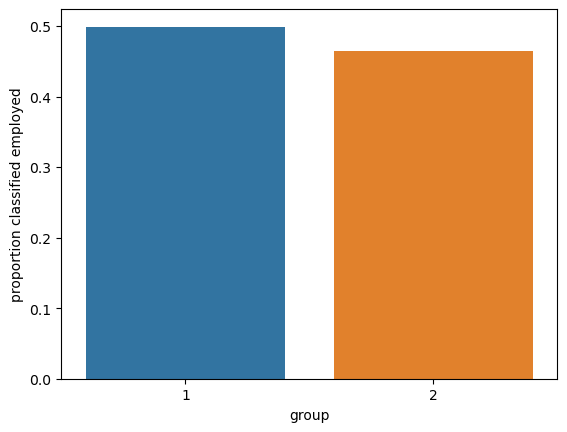 means = df_test.groupby("group")["pred"].mean().reset_index(name ="proportion classified employed")print(means)p = sns.barplot(data = means, x ="group", y ="proportion classified employed")