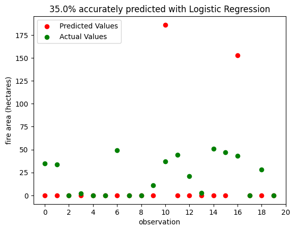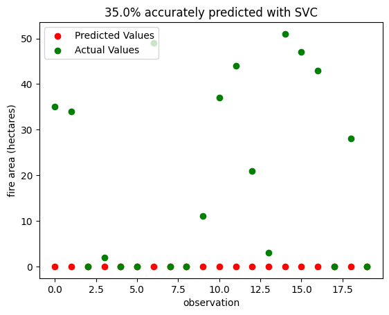 Figure 4 shows the same observations, predicted using the SVC model. It also gets 35% correct, but unlike the LR model, it only ever underestimates the area of fires, while the LR model overestimates several. This suggests that the SVC model is slightly more conservative, and may fail to predict the largest fires.